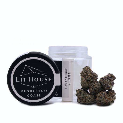 Zkittlez x Gelato The grass truly is greener in California and this red hot strain from the Cookies Fam is a shining example of Golden State excellence. Bred from two award winning Cali classics, Zkittlez and Gelato, Runtz achieved instant celebrity status for its mouth-watering candy fruit flavor that is so tasty you just have to keep hitting it. A luscious tropical fruit aroma is highlighted with bright tangy citrus and rich earthy undertones. The high comes on smooth, with a simultaneous tingling, flowing body buzz and an active, inspired mental state, making Runtz an ideal functional creative strain. Like a soothing boardwalk evening, the thick Runtz buds are a deep indigo and viridian color, lit up with twinkling soft ember stigmas and stardust trichomes. Exhilarating yet tranquil, stimulating yet soothing, like the incomparable Pacific herself, Runtz captures all the greatness, glamour, and fertile magic of our beloved Golden Coast. Our LitHouse premium eighth jars contain 3.5 grams of small-batch, craft grown, cannabis flower. LitHouse focuses on flavor and potency. All of our flower is slow cold-cured and expertly trimmed for maximum terpene preservation. You can always count on high quality and consistency in every jar from LitHouse.
